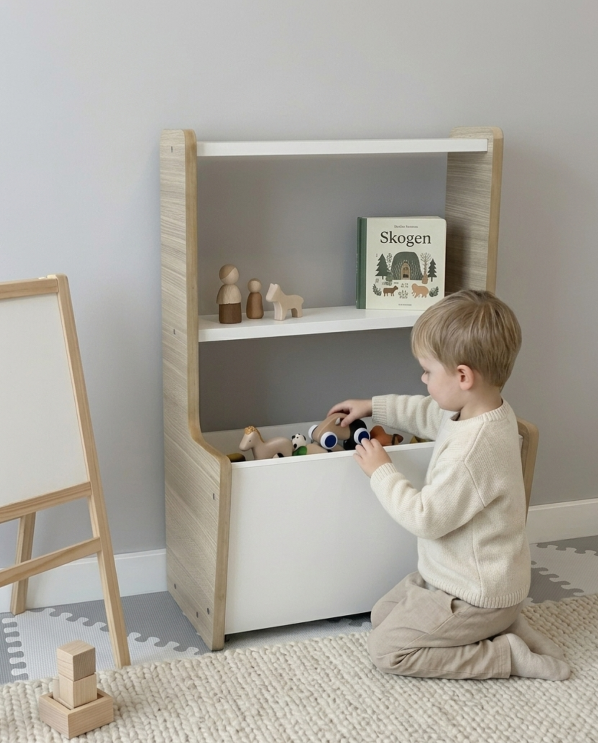 Orientación Montessori: los estantes a la vista y el baúl accesible fomentan que el nene elija, use y guarde sus juguetes de forma autónoma, sin depender de un adulto.